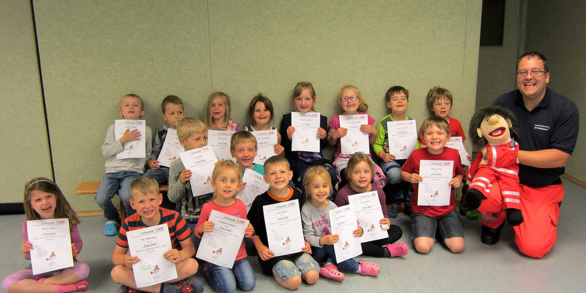 Porta Westfalica/ Kleinenbremen. Am 09.06. und 10.06.2016 hat der DRK-Ortsverein Barkhausen e.V. im evangelischen Kindergarten Kleinenbremen Kinder zu Erst-Helfern ausgebildet. Unter dem Motto: „Trau Dich- keiner ist zu klein um Helfer zu sein“ hat Rotkreuzleiter Jochen van Loh mit seiner Handpuppe FRED den Kindern die Grundlagen der „Ersten-Hilfe“ beigebracht. Es ging um den Notruf 112. Wie man diesen Notruf absetzt wurde praktisch mit Telefonen durchgespielt. Auch das Trösten von verletzten Kindern wurde angesprochen und das holen eines Erwachsenen bei Verletzungen.